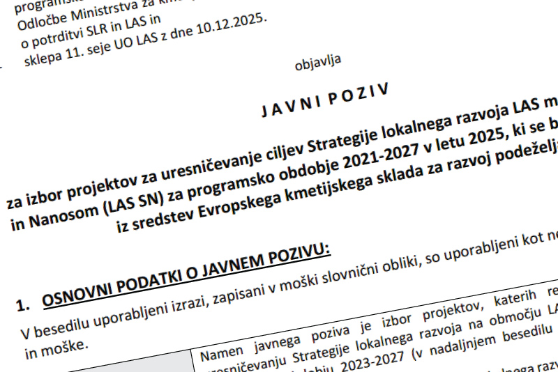 LAS med Snežnikom in Nanosom je dne 12. decembra 2025 objavil 3. javni poziv za sofinanciranje projektov SLR LAS iz Evropskega kmetijskega sklada za razvoj podeželja. Javni poziv je odprt do 27. februarja 2026.